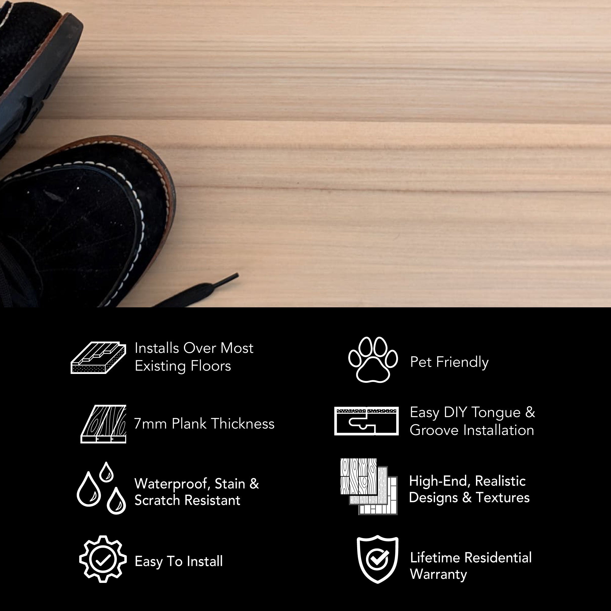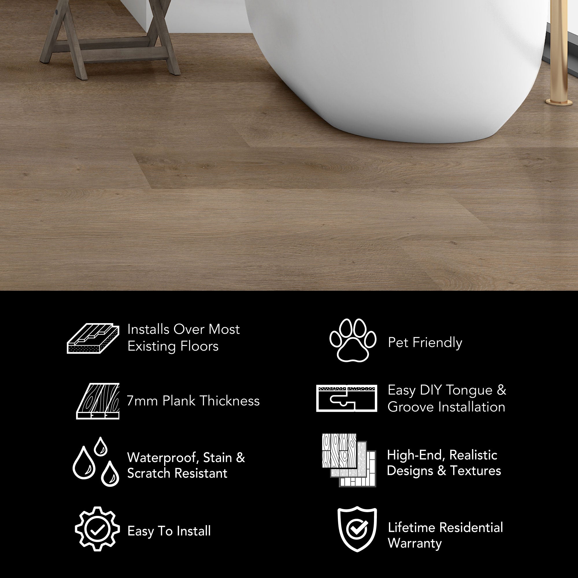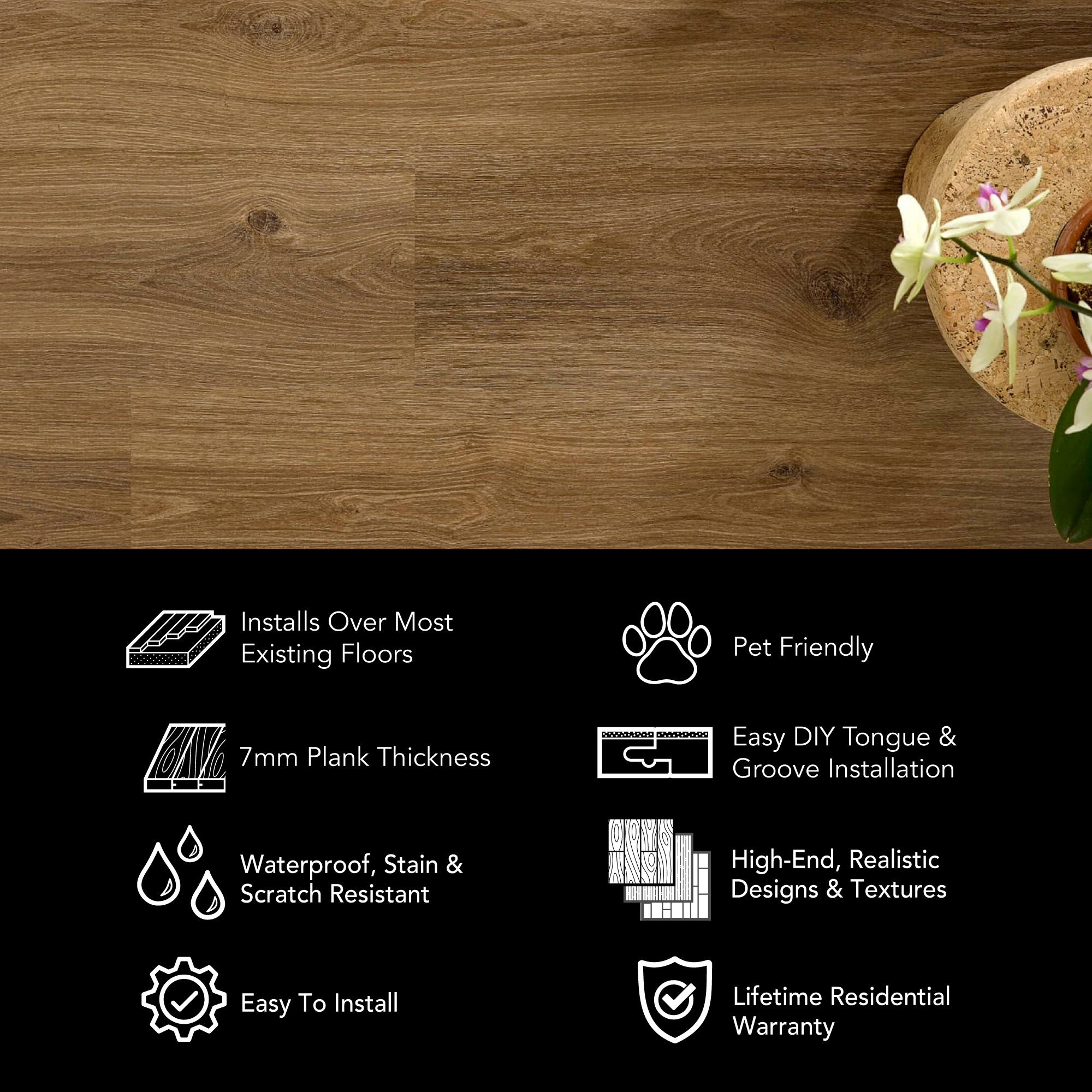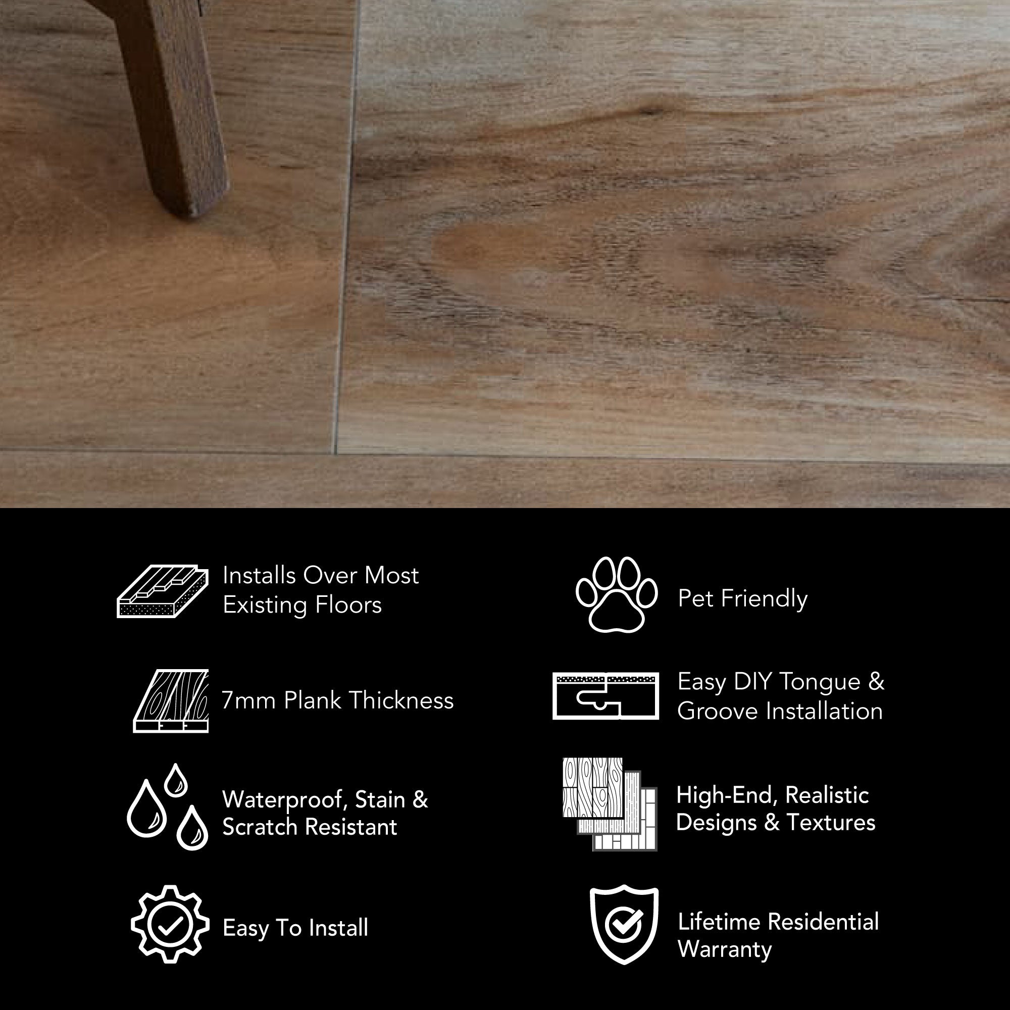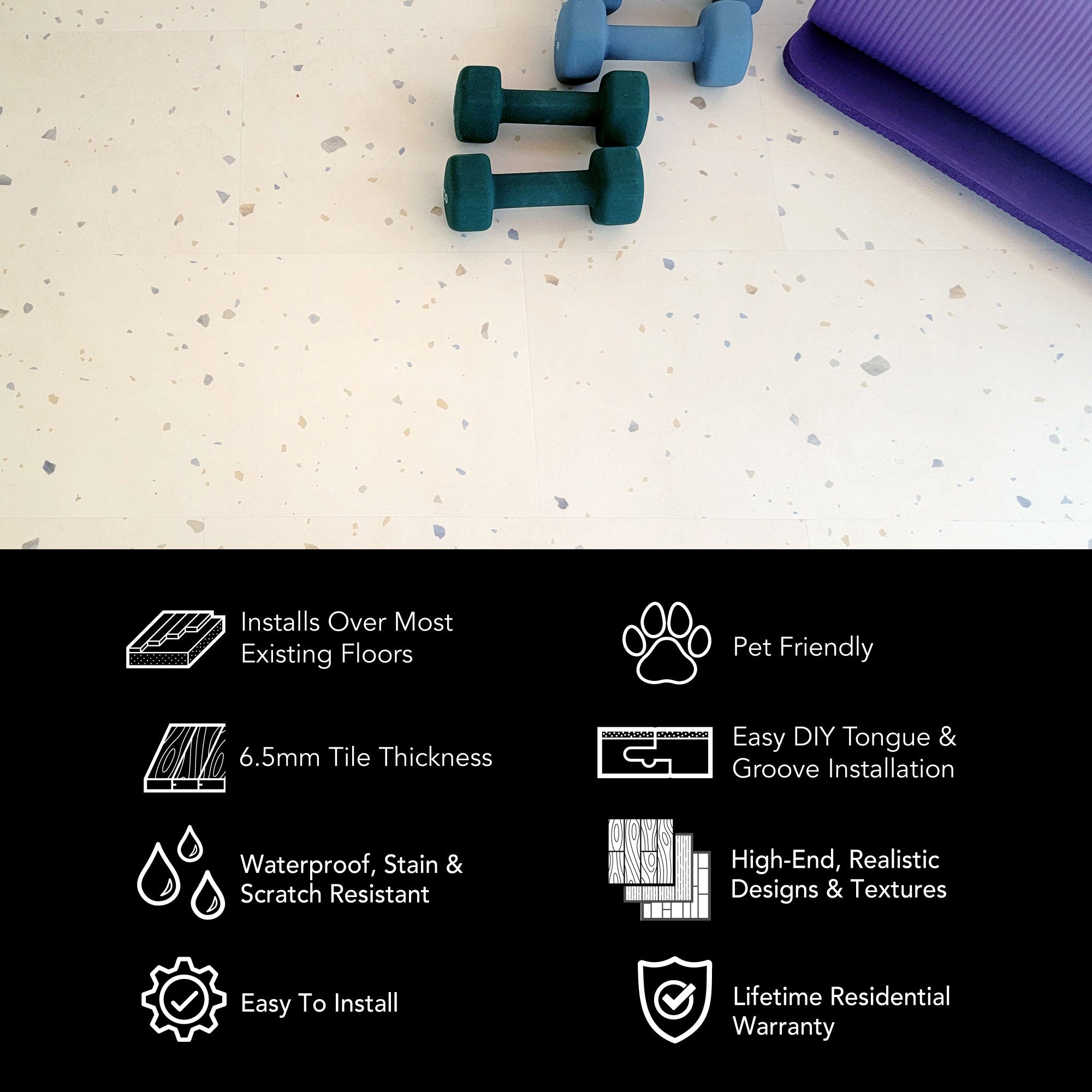 Whether it's our 8mm vinyl plank flooring or our 6.5mm terrazzo tiles, we've got the easy click together vinyl floors you need. Install your LVP flooring faster and easier with our tap-in click lock flooring system.
