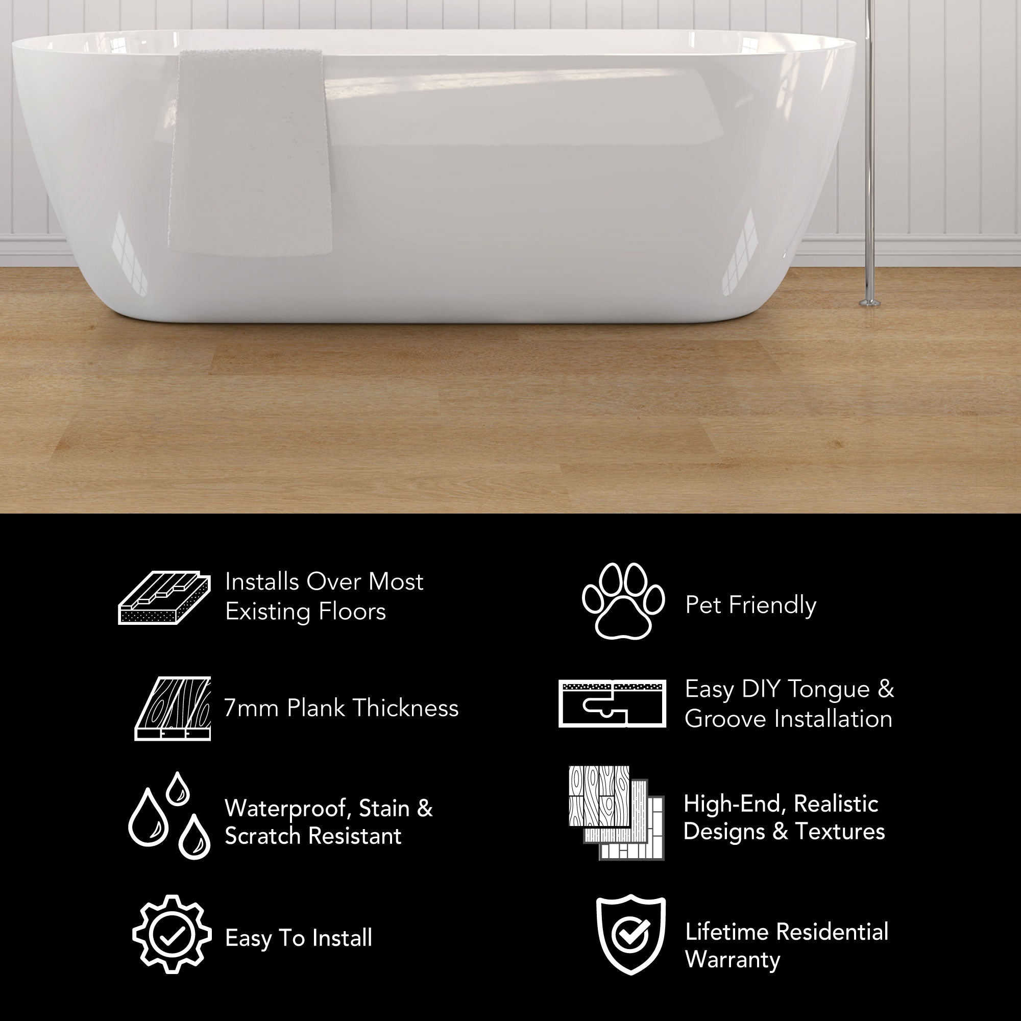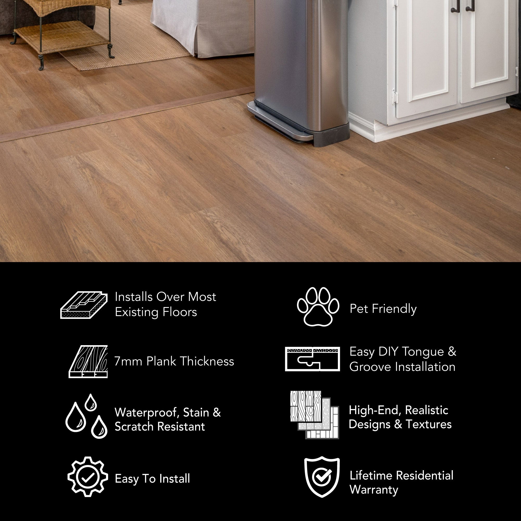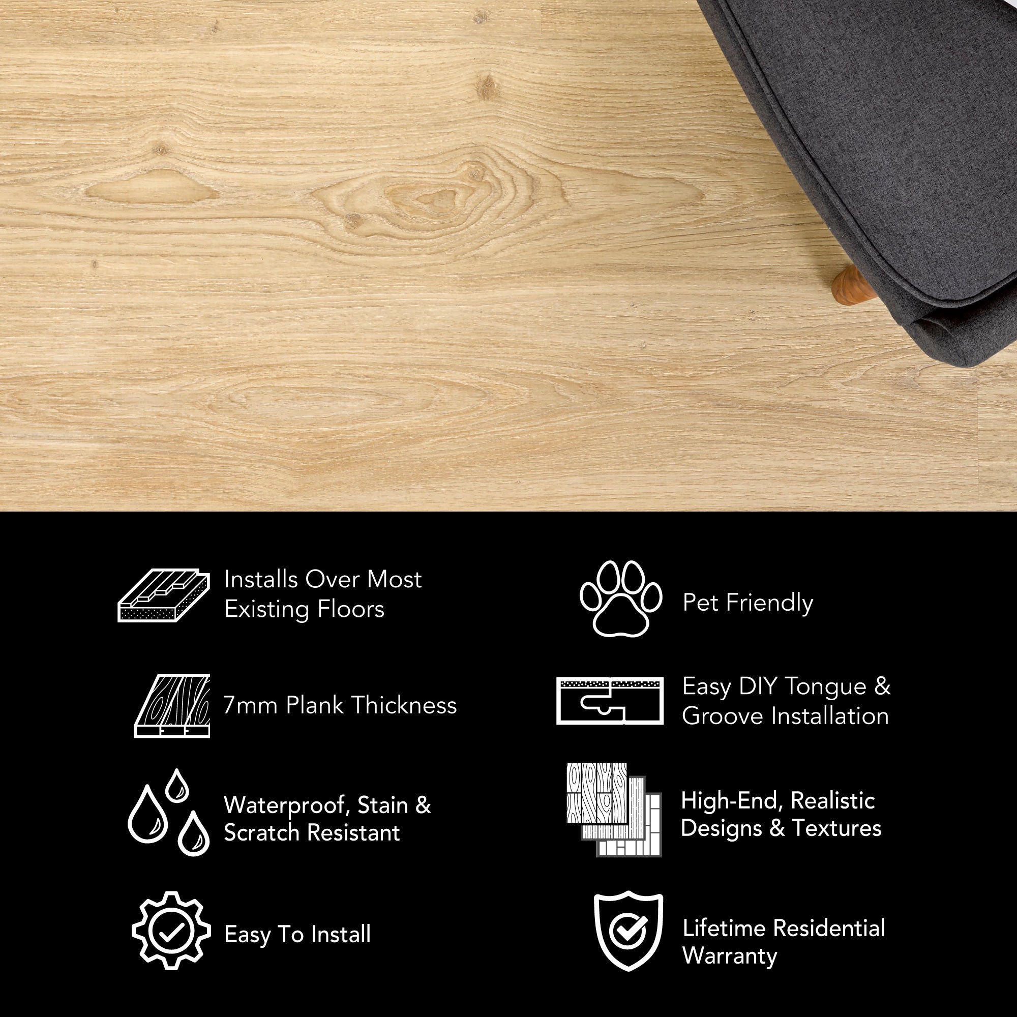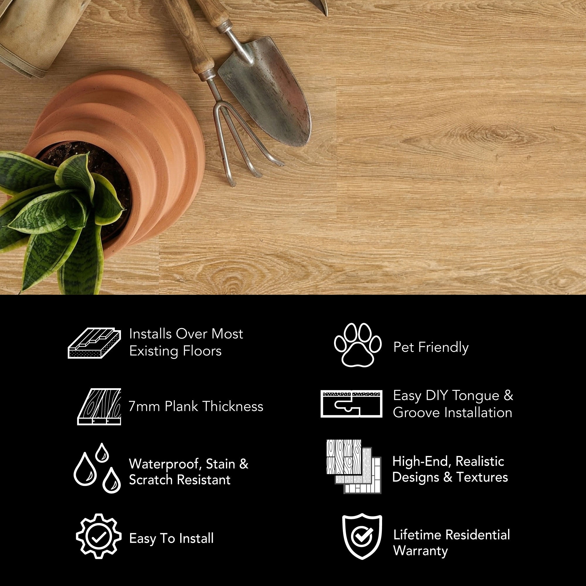 Whether it's our 8mm vinyl plank flooring or our 6.5mm terrazzo tiles, we've got the easy click together vinyl floors you need. Install your LVP flooring faster and easier with our tap-in click lock flooring system.