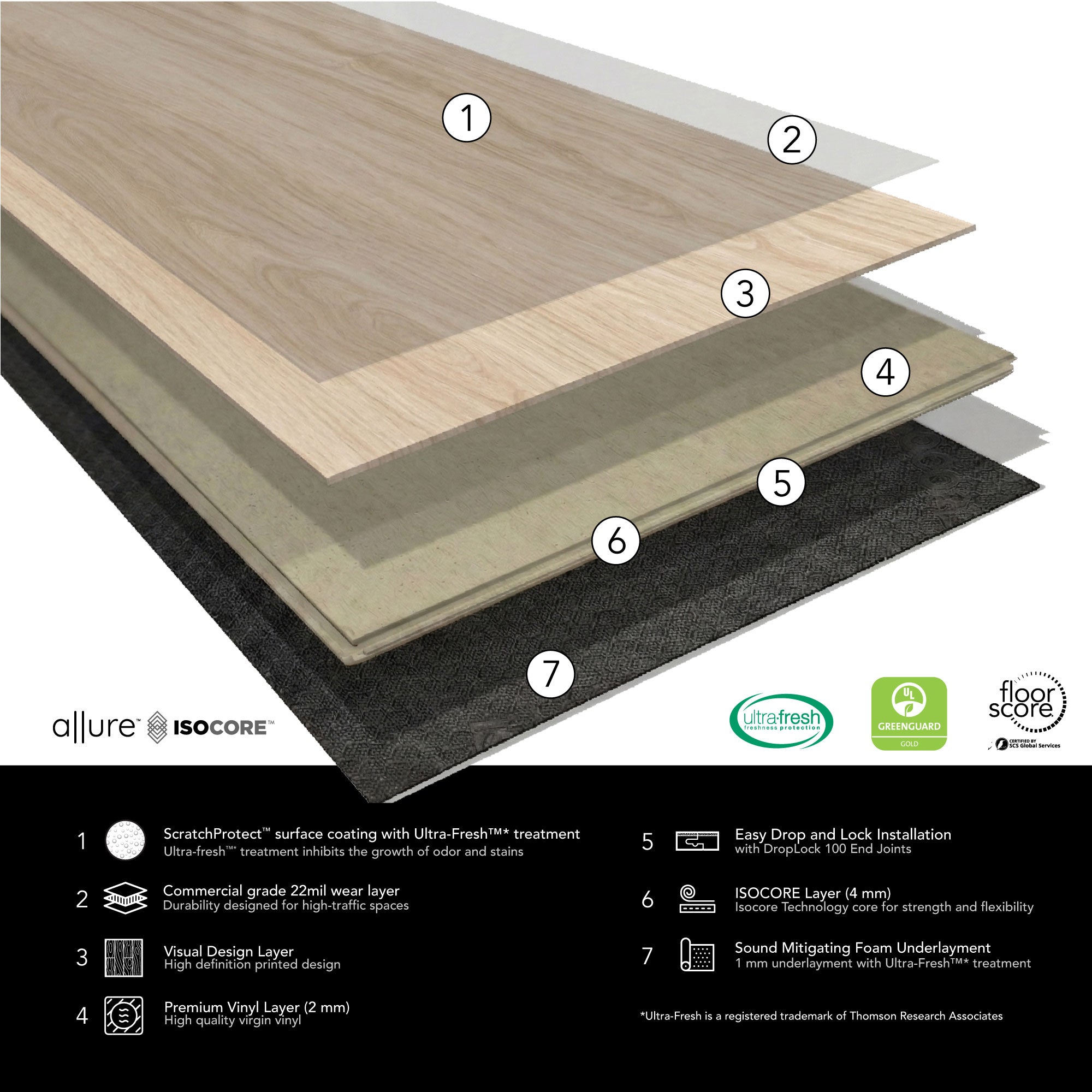 Allure’s wide plank rigid-core vinyl features ScratchProtect™—a permanent coating that helps shield your floors from scratches and stains. With its 22‑mil wear layer and ultra‑durable ISOCORE construction, this luxury vinyl delivers maximum scratch resistance—perfect for pets, high traffic, and everyday living.