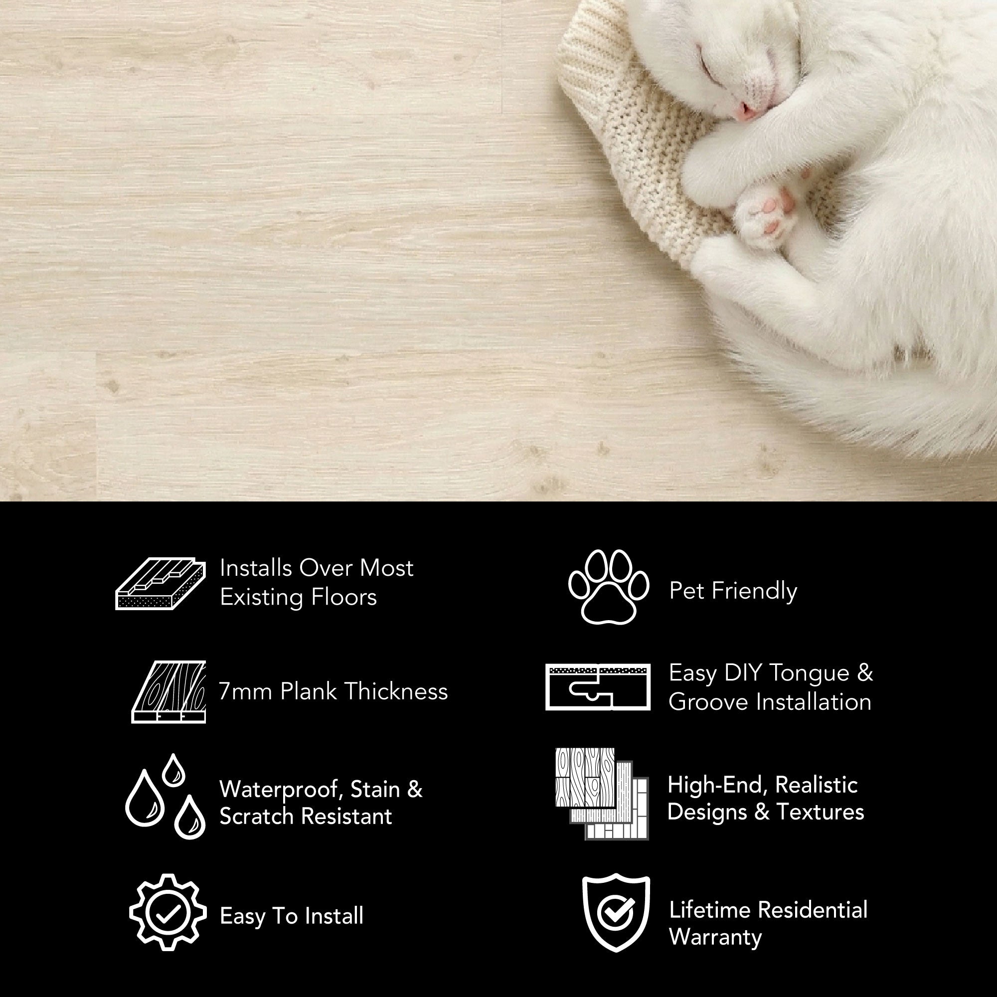 - Light Oak Color – Soft, beachy tones and embossed-in-register grain deliver a clean, contemporary hardwood look.